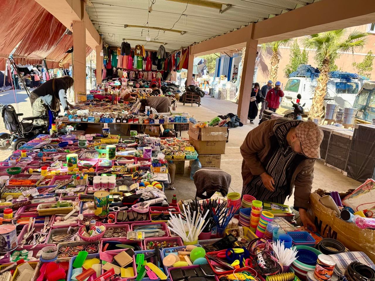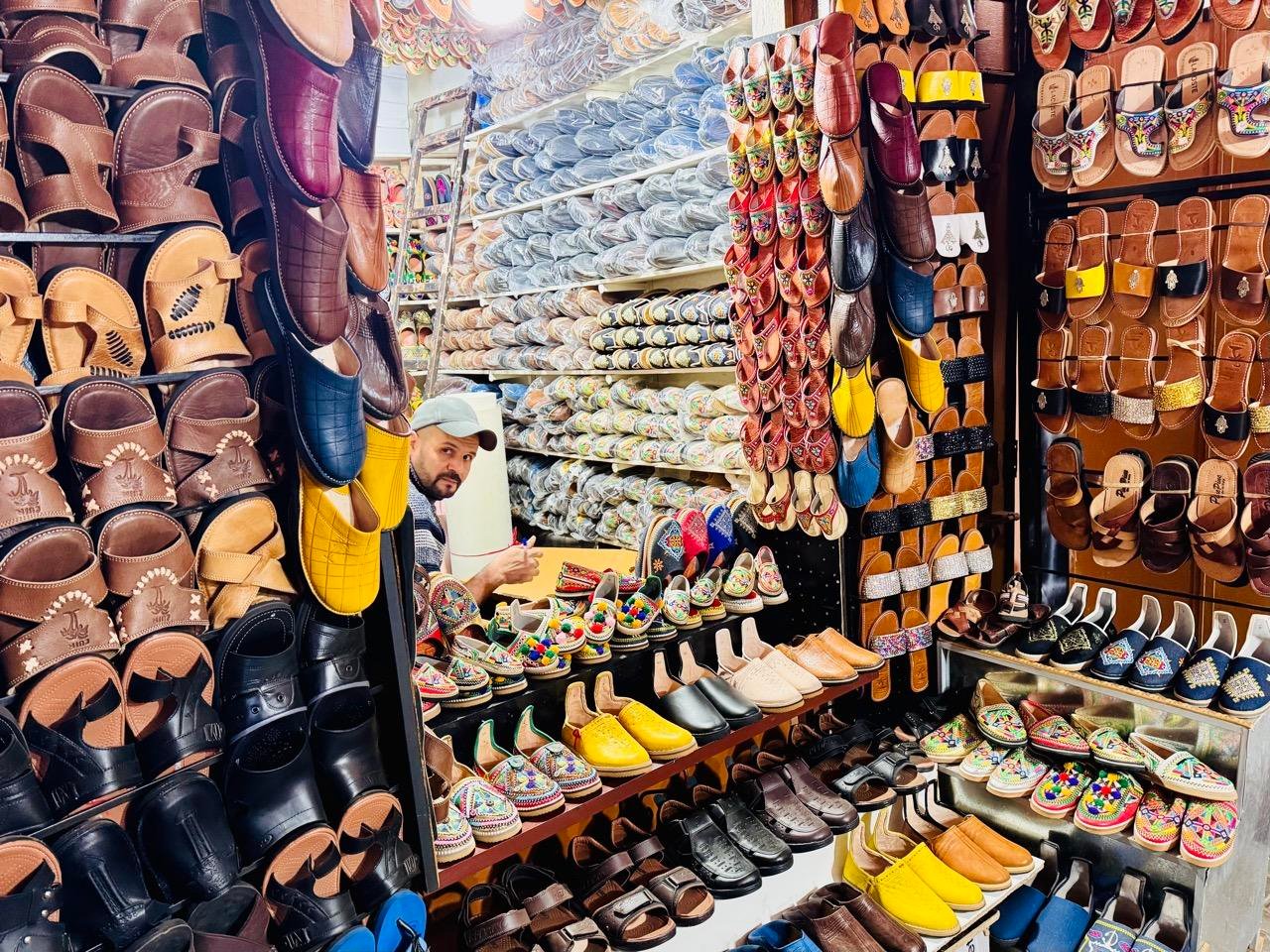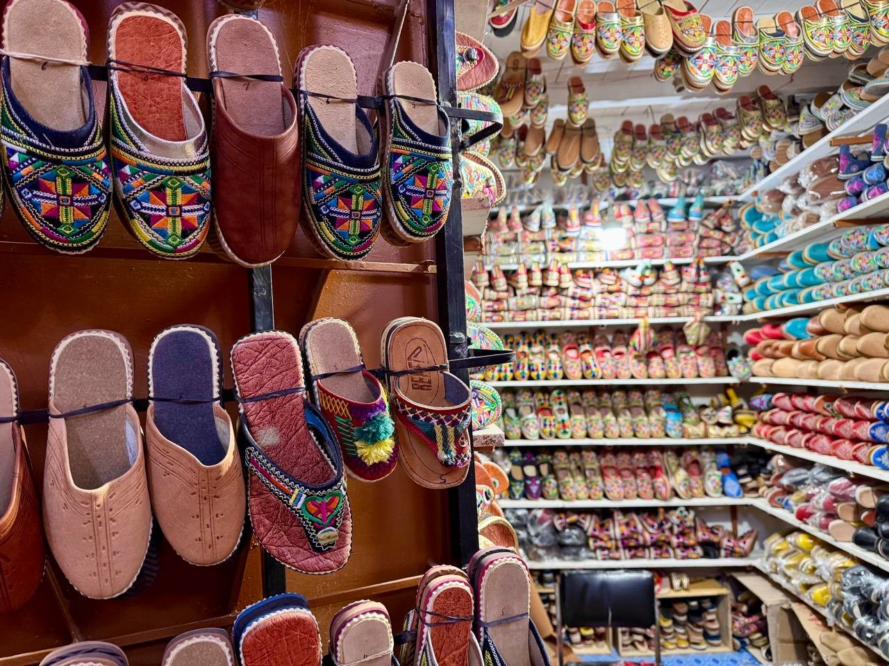 De volgende dag ga ik, na de koffie met verse croissant, samen met Leo het dorp verkennen. We wandelen een rondje over de markt, ik bekijk de kleurige kleding en de vele schoenenwinkels, leuk! Tafraout is bekend van de handgemaakte Babouche (Berber) slippers.