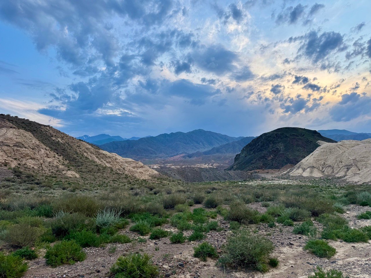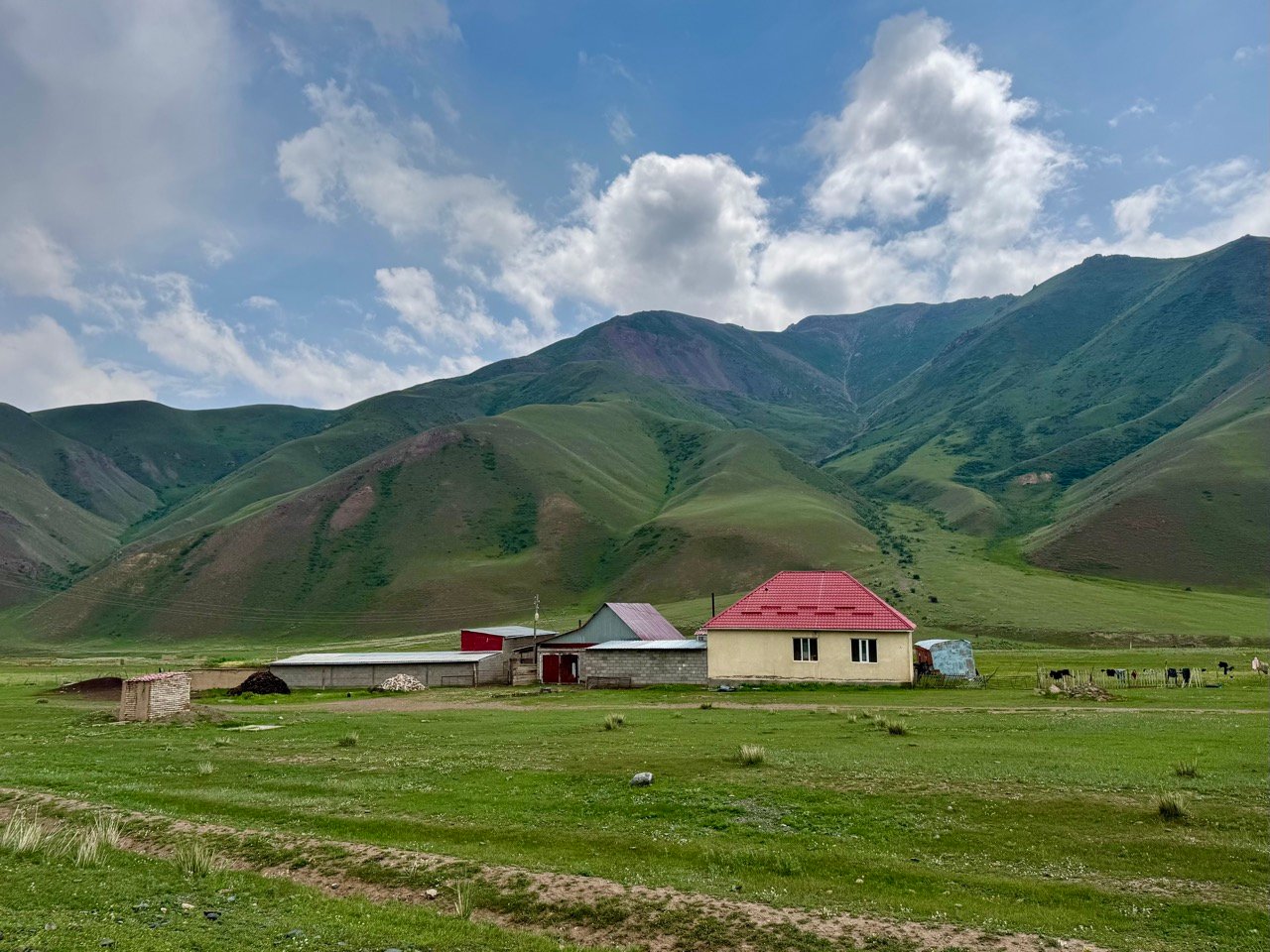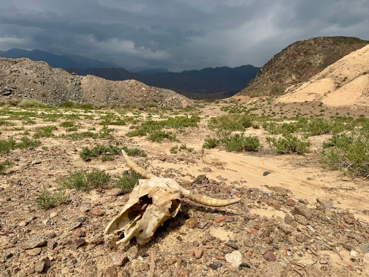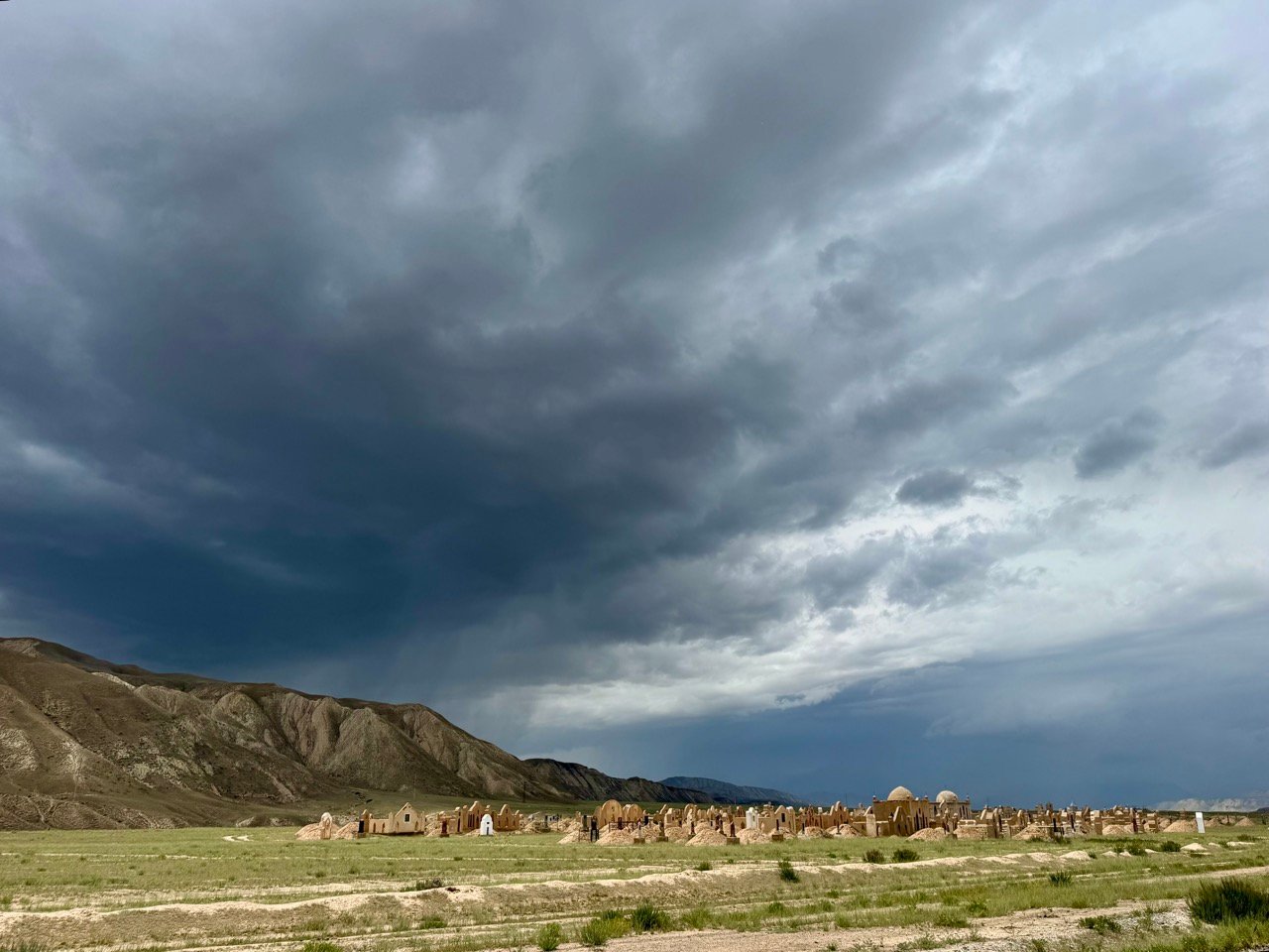 I continue along the Silk Road towards Osh. The scenery is gorgeous! Rivers and mountains in all sorts of different colors, small villages, cemeteries in beautiful locations, and finally, our parking lot next to an abandoned farmhouse. In the middle of nowhere and complete silence, except for a massive thunderstorm that passes by.