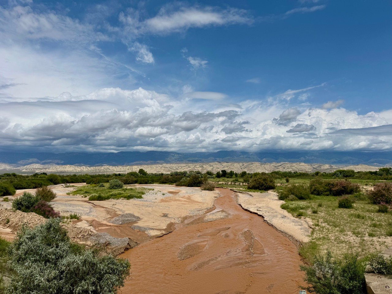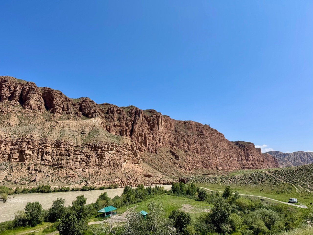 We park in the town of Naryn along the river and between the mountains at an altitude of 2,000 meters, a wonderful place to sleep 😍