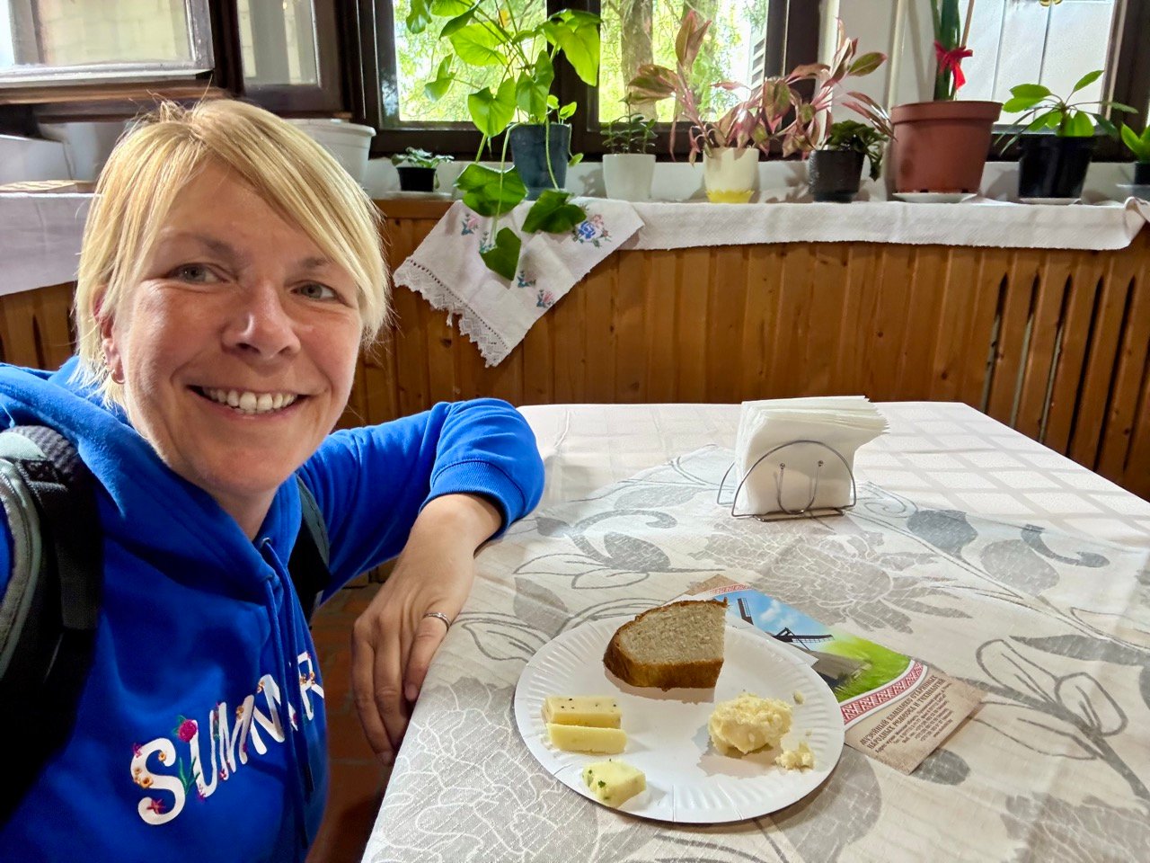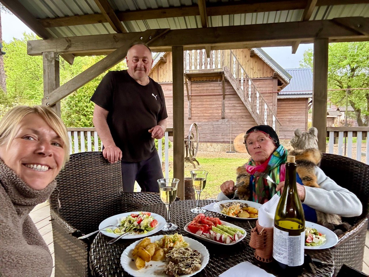 I drive inland to stay with the locals. A warm welcome from Valery and his son Slava, we can park in the garden. German Barbara also parks here and we order a typical White Russian dinner from Valery. Pork potatoes and coleslaw, also salad with pieces of cheese as a starter. Valery comes to chat and drinks a glass of wine with us, a great evening!