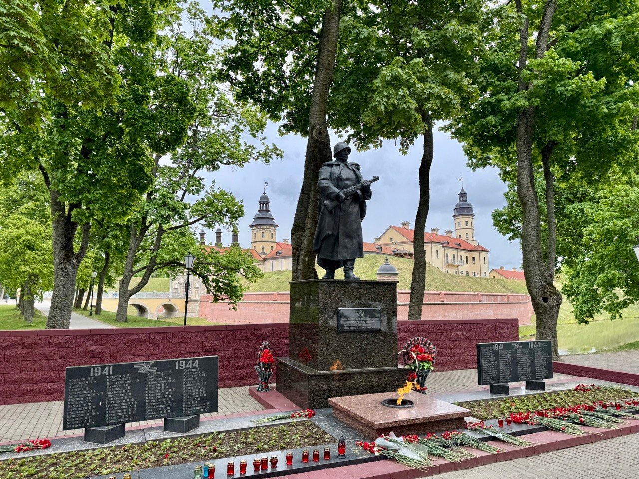 Nesvizh Castle is nearby so I’m going there too, Valery’s tip. First a lovely church, then a driveway to the magnificent castle. Entrance €6 and dogs are not allowed.