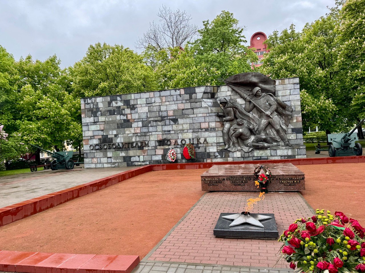 Leo and I walk along the river, the weather is lovely and I decide to walk to the fortress, about 3 km. I look at the beautiful St. Nicholas church, the gigantic monument of the Brutalist Titan and other monuments. There was a 9th of May celebration in connection with the liberation of Nazi Germany, there are flowers and a fire burning.