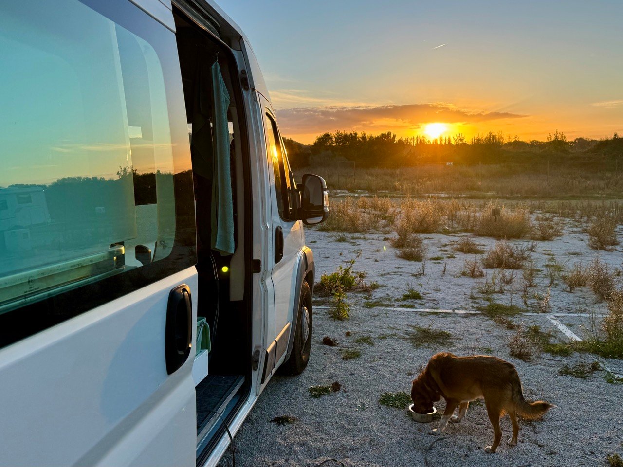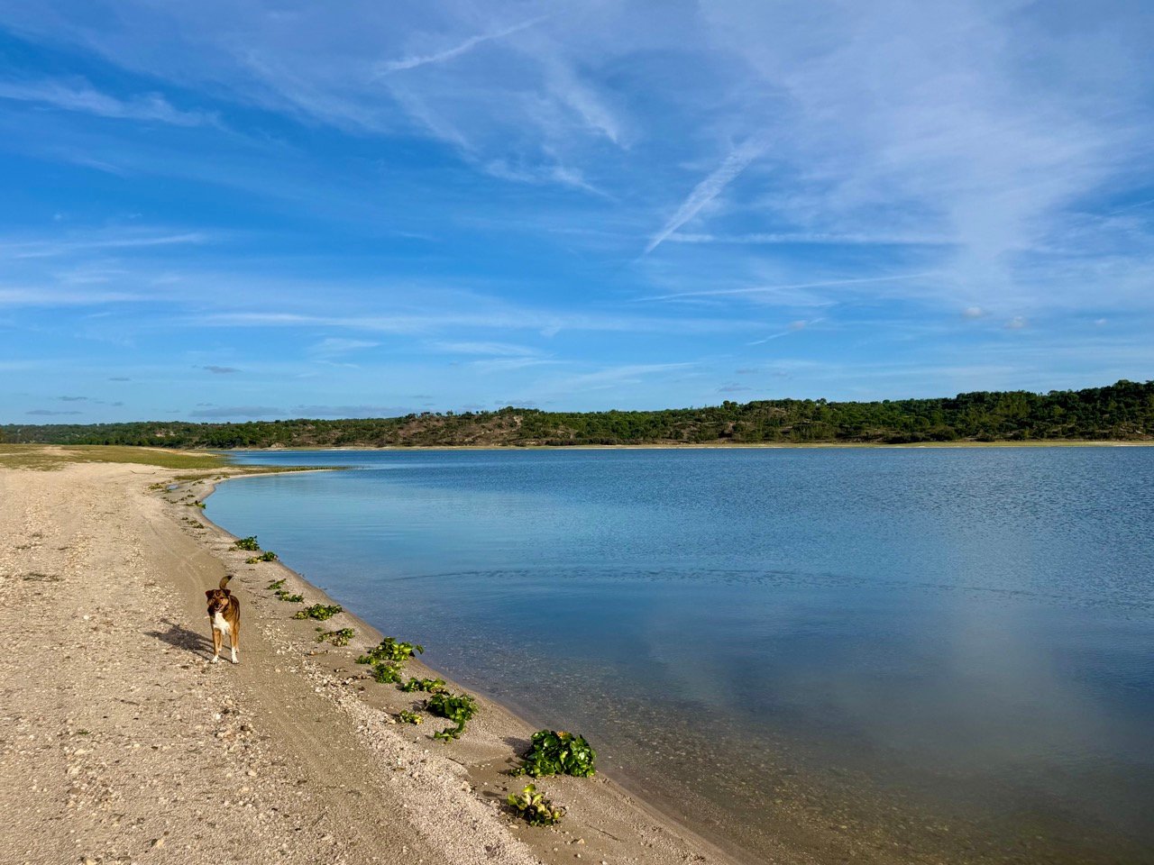 At Lake Montargil, we take a walk on the beach. Leo plays in the water and runs along the sandy path, a happy dog! It’s a lovely walk and when we arrive back at the campervan, we’re tired but satisfied. Time to relax!