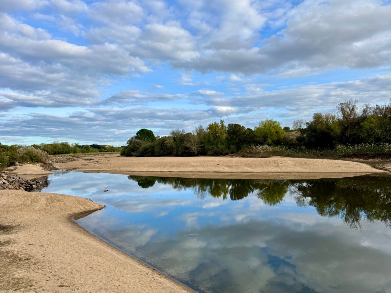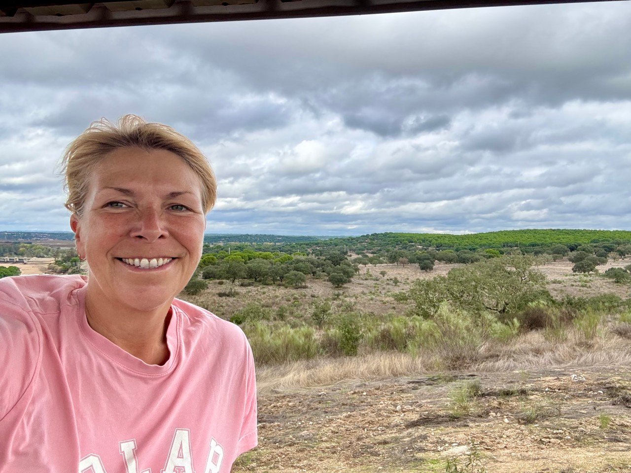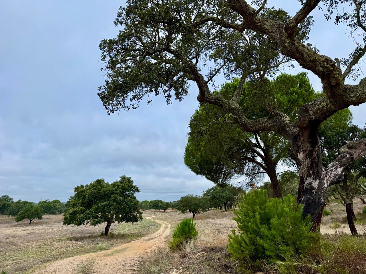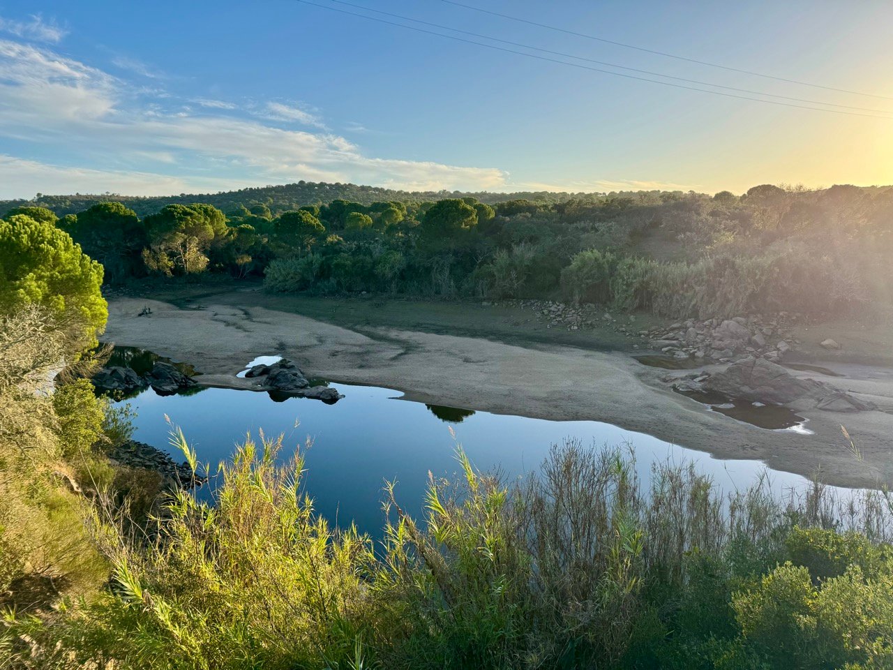 Then a walk through the woods with many holm oaks, past an abandoned farmhouse, I survey the surroundings from the lookout tower and walk back along the river. There are herons and small birds to spot!