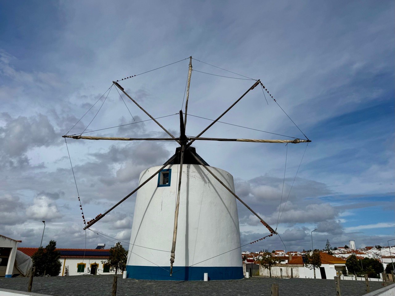 Castro Verde is a charming village with a white church and a large basilica. There’s also an old white and blue windmill. The wind blows hard and the stationary blades make a whooshing sound.