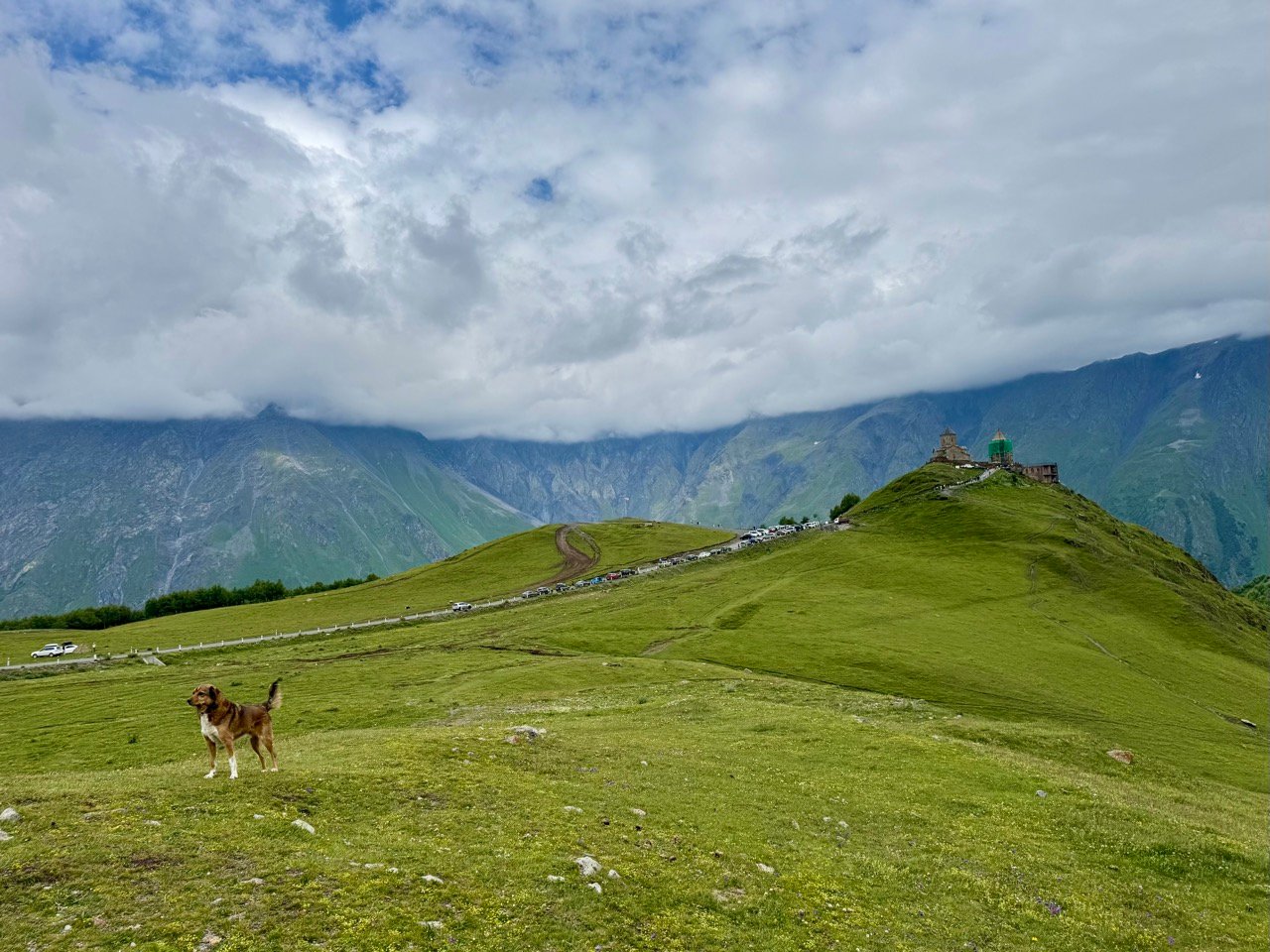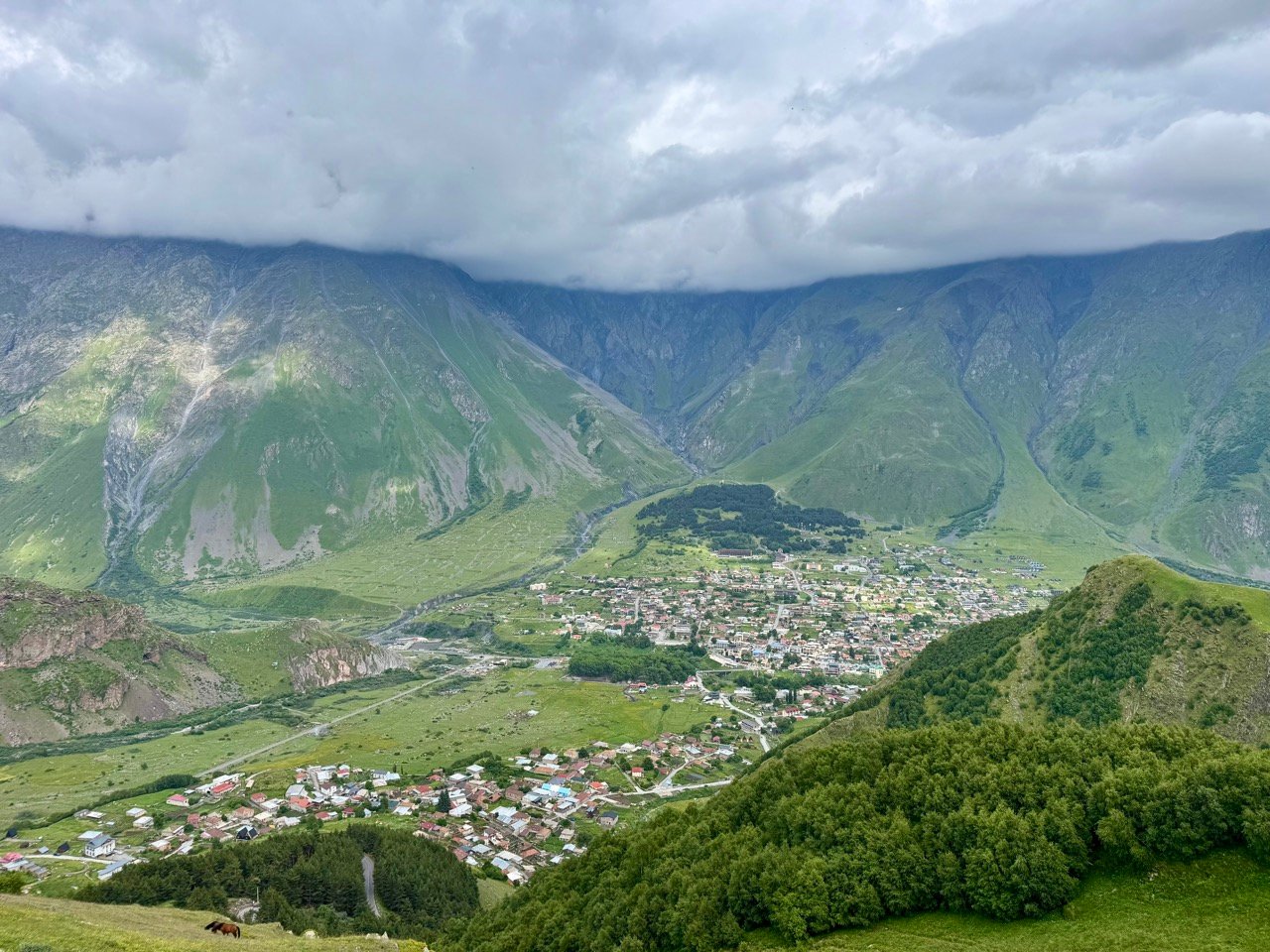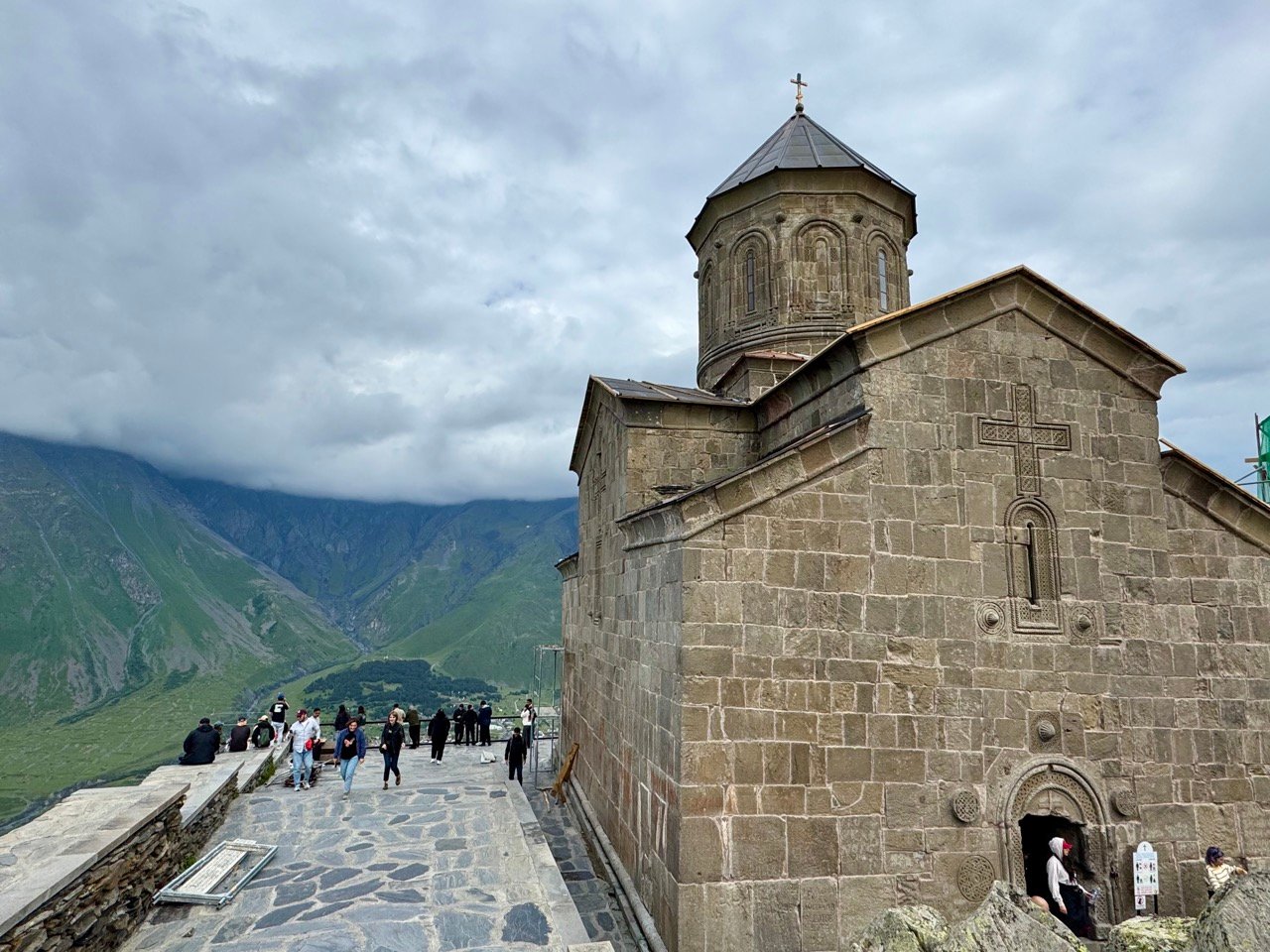 I drive along a mountain road to the village of Kasbegi, now called Stepantsminda. First, I need to withdraw some money, but the ATM in the village is empty. Eventually, I walk around the village and up the mountain in my flip-flops to find a working ATM. You can also easily exchange money here, haha, so I recommend to change money ๐