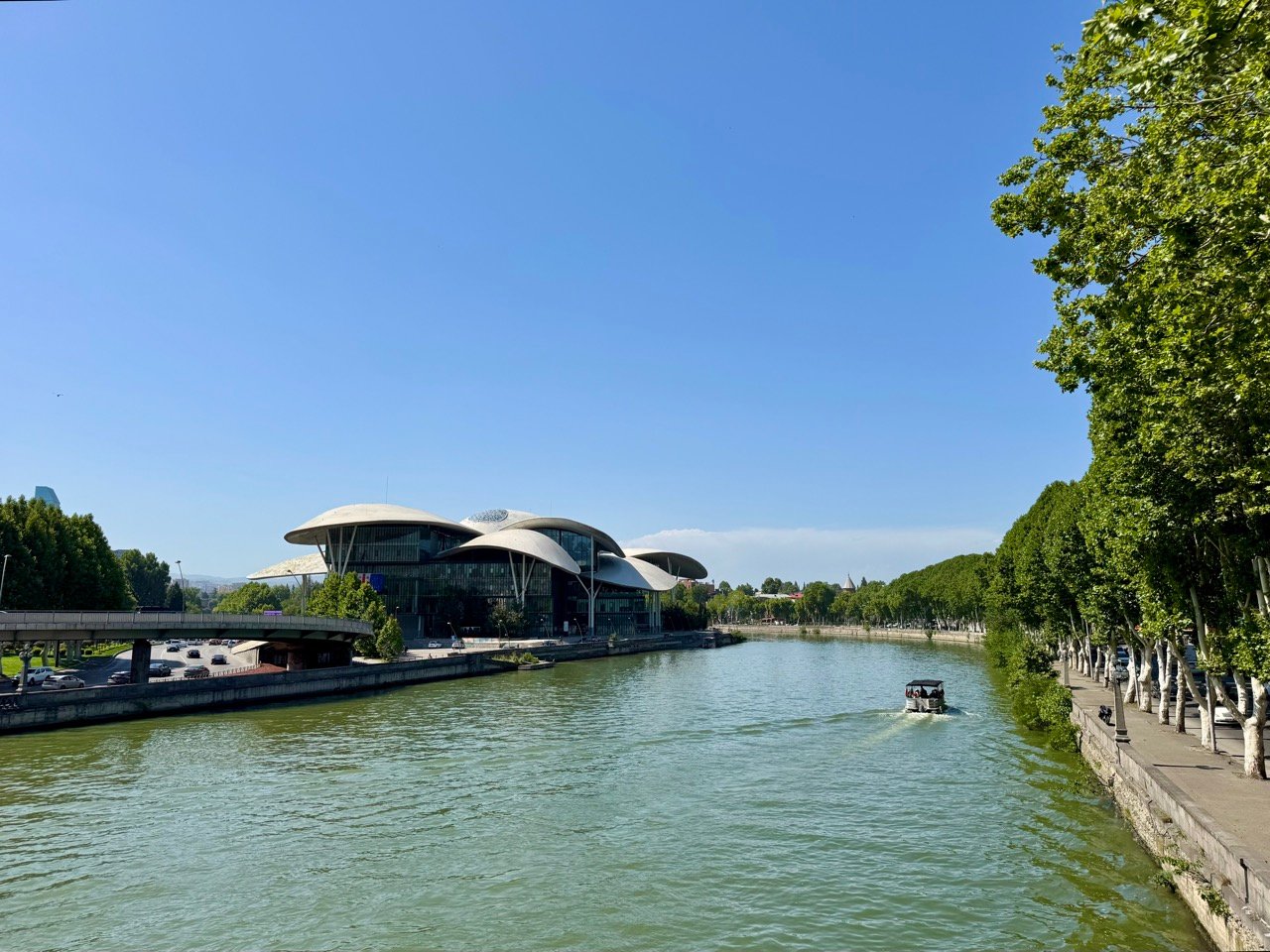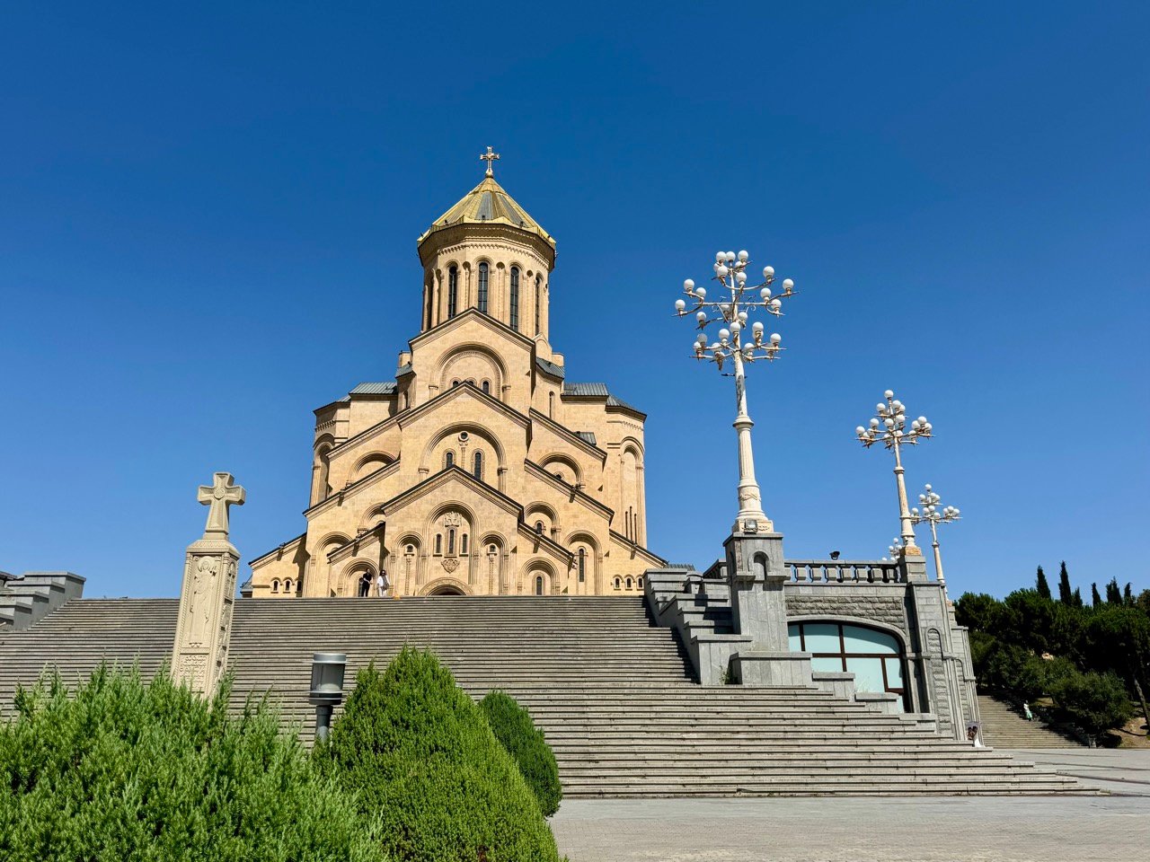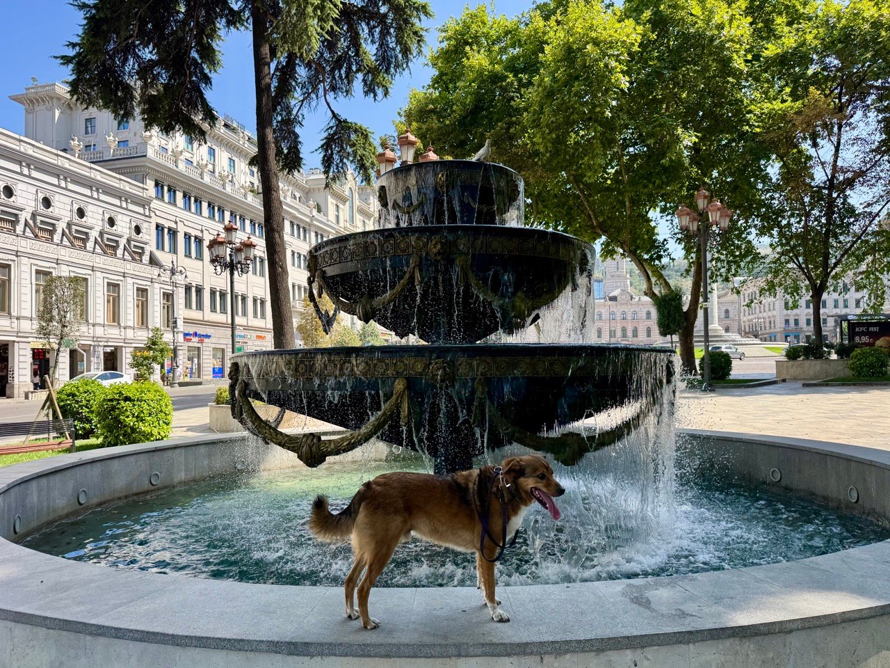 In the capital, Tbilisi, we visit the Cathedral, Old Town, Victory Square, and the Peace Bridge. I try kachapuri for the first time: baked bread with cheese and egg. It’s 38 degrees Celsius, very warm for a city visit, and Leo cools off at the fountain.