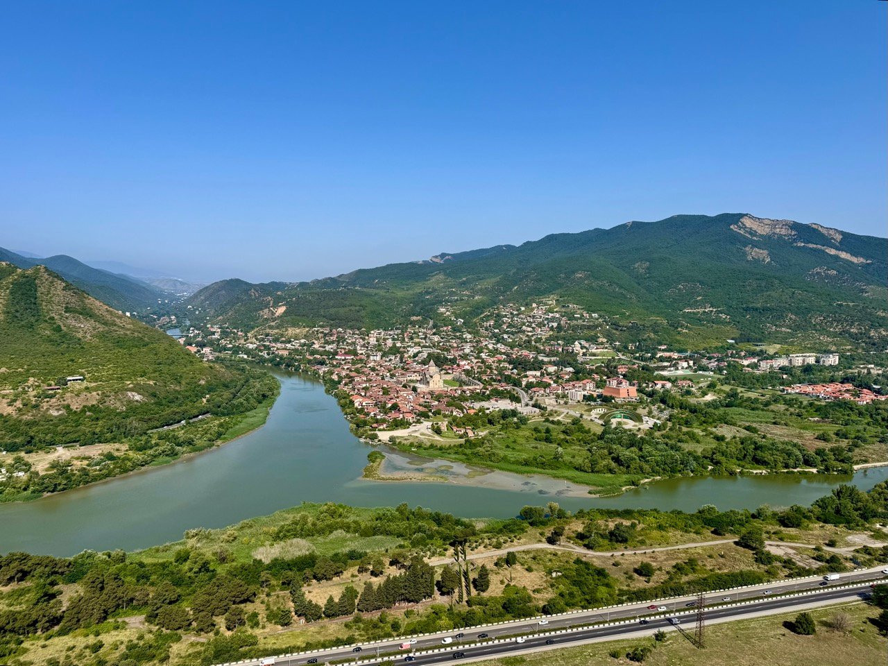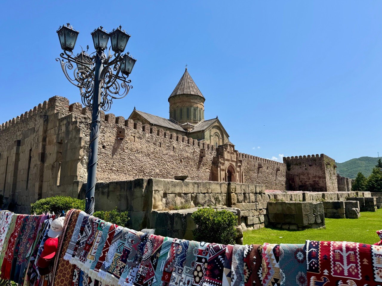 The village is built around Svetiskhoveli Cathedral. Leo and I are sitting on a terrace, letting the tourist crowds pass us by. There are tons of souvenirs for sale; I’m now the proud owner of a Georgian rug.