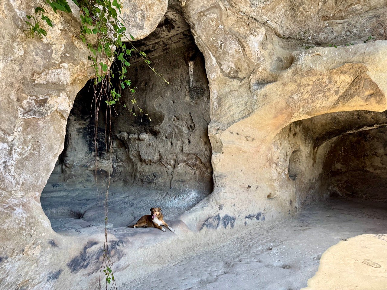 Even though it’s 38 degrees Celsius, we walk up and look into all the caves. And of course, at the small church at the top. I photograph a lizard, and Leo waits in the cave to cool off. In a photogenic spot, nice!
