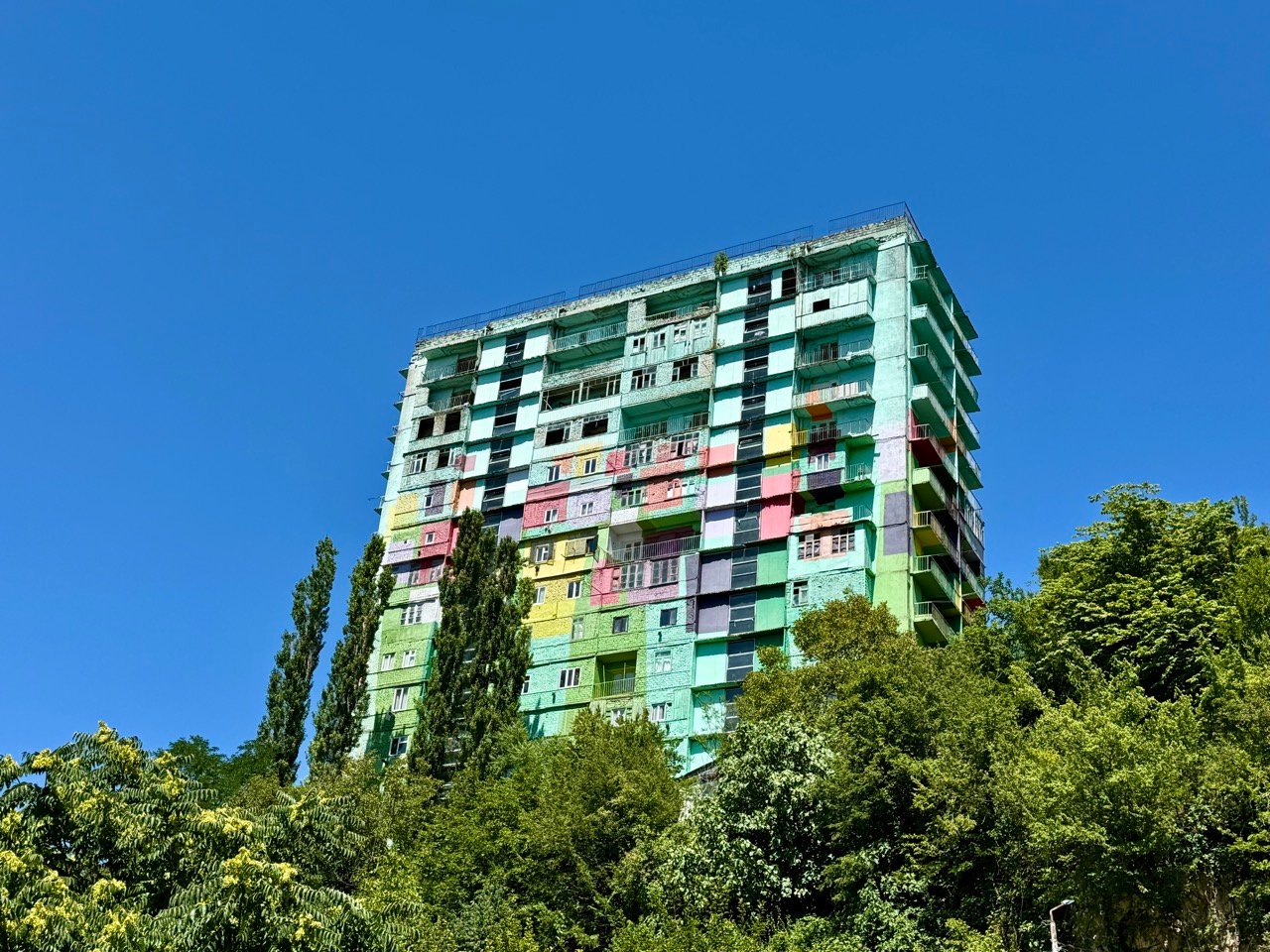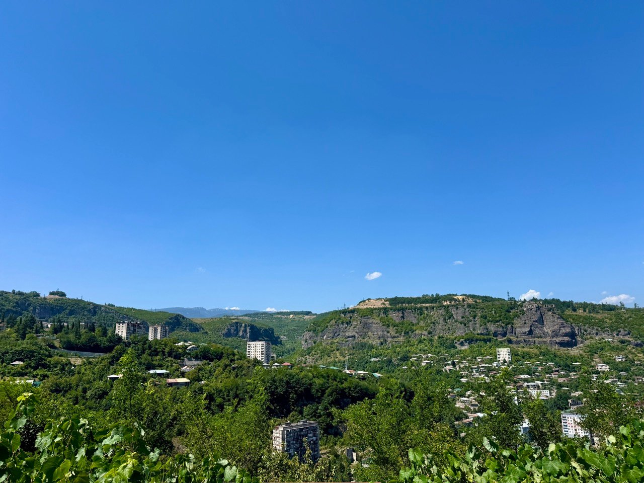I drive through a mountain pass to Chiatura, a village with many remnants from the Soviet era. I enjoy the expansive view with old apartment buildings towering above. We look at old buildings, and to my great surprise, a few people still live here. They turn out to be refugees from the Georgian regions of Abkhazia and South Ossetia.