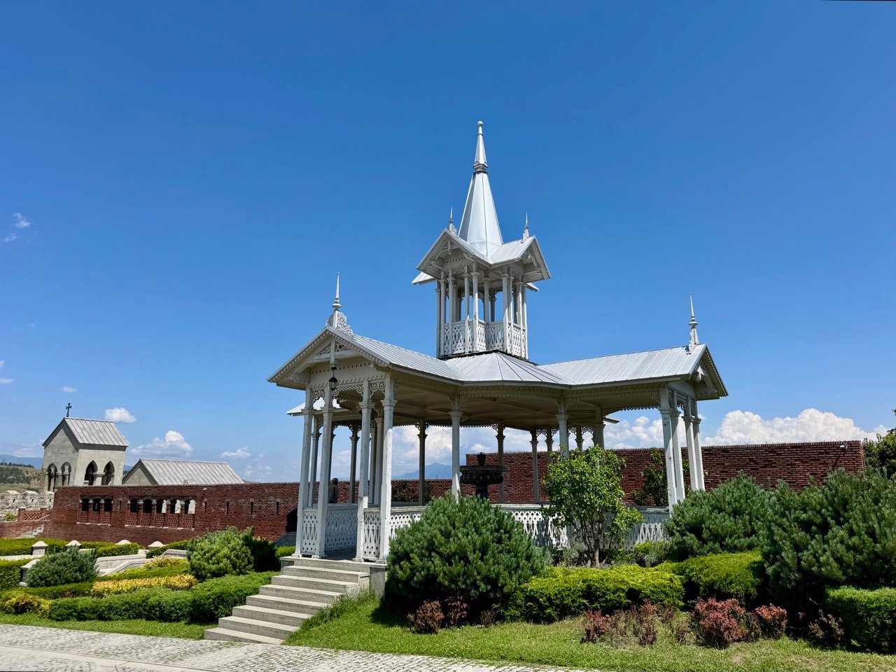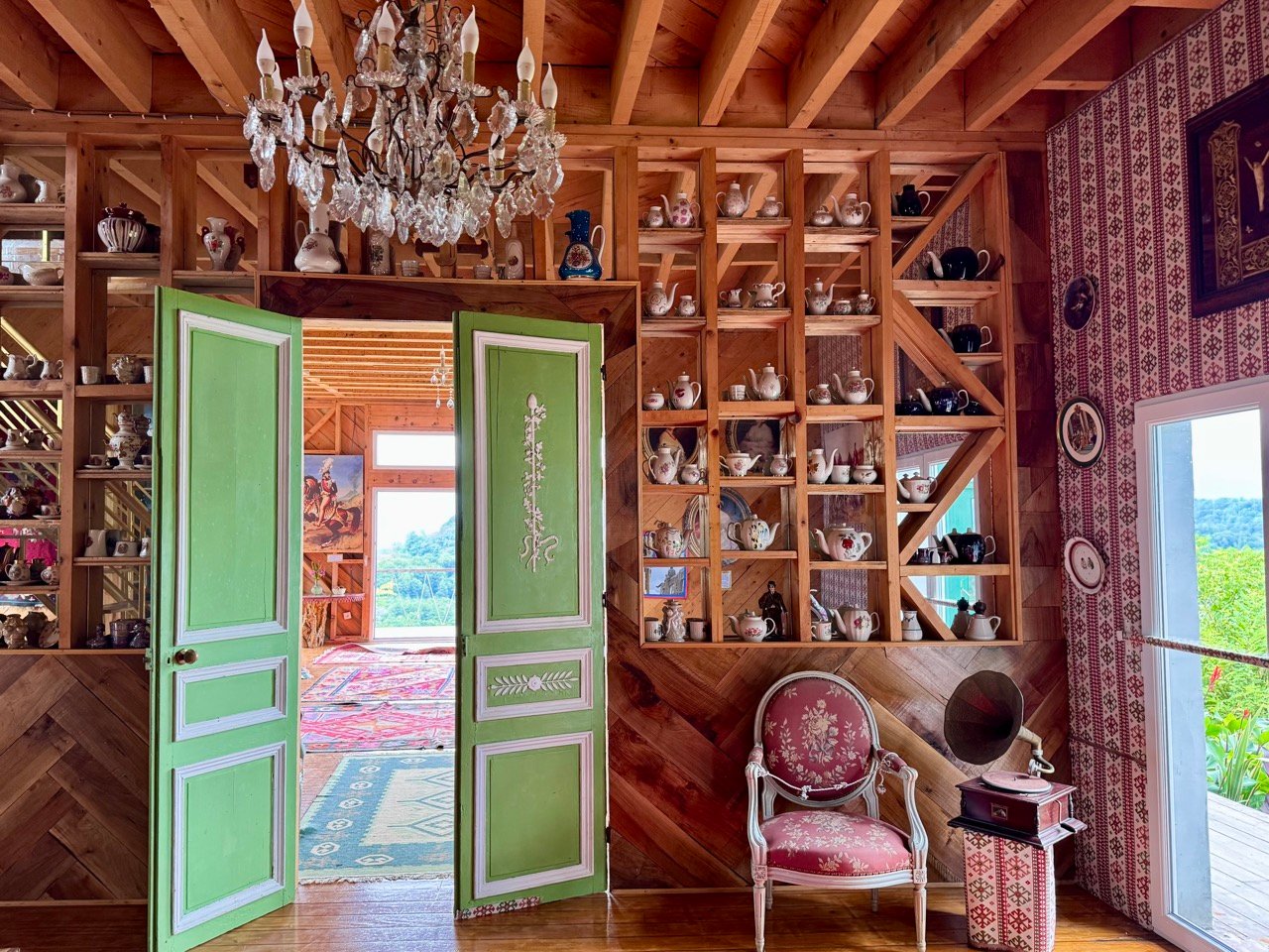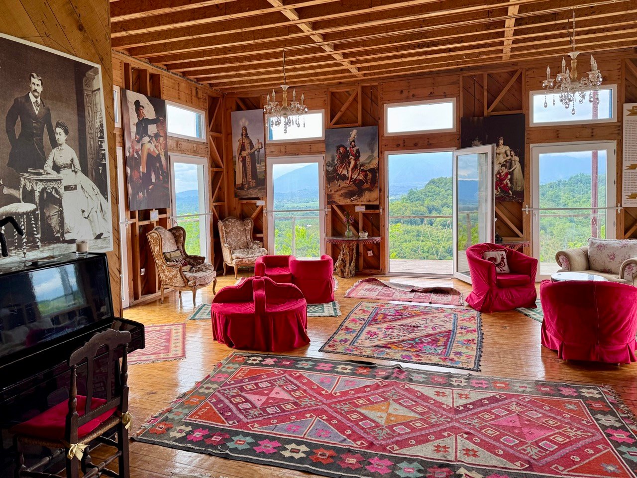In Zugdidi, we spend the night at New Chateau Chkaduachi. It’s a unique spot with mountain views. The owner, Prince Murat, offers us a drink, tells wonderful stories, and is happy to show us his self-built (little) castle. We’re parked on the grass, and Leo loves it here. He is relaxing among the flowers.