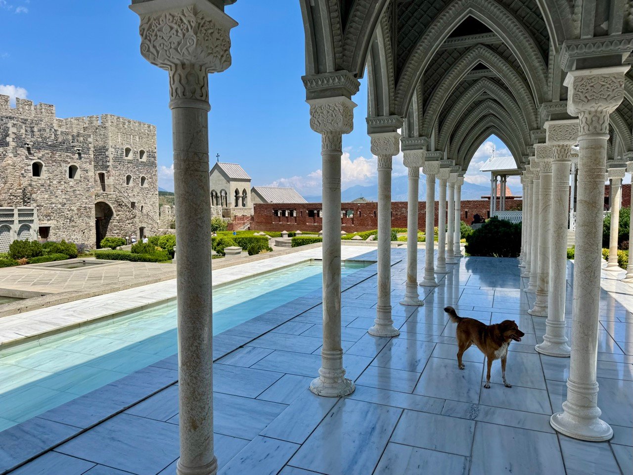 The Rabati Castle Complex in Akhaltsikhe has a large medieval castle and a mix of various other buildings. We walk over the castle walls, past ponds, and through green gardens. Leo joins me and goes for a swim in the castle pond.