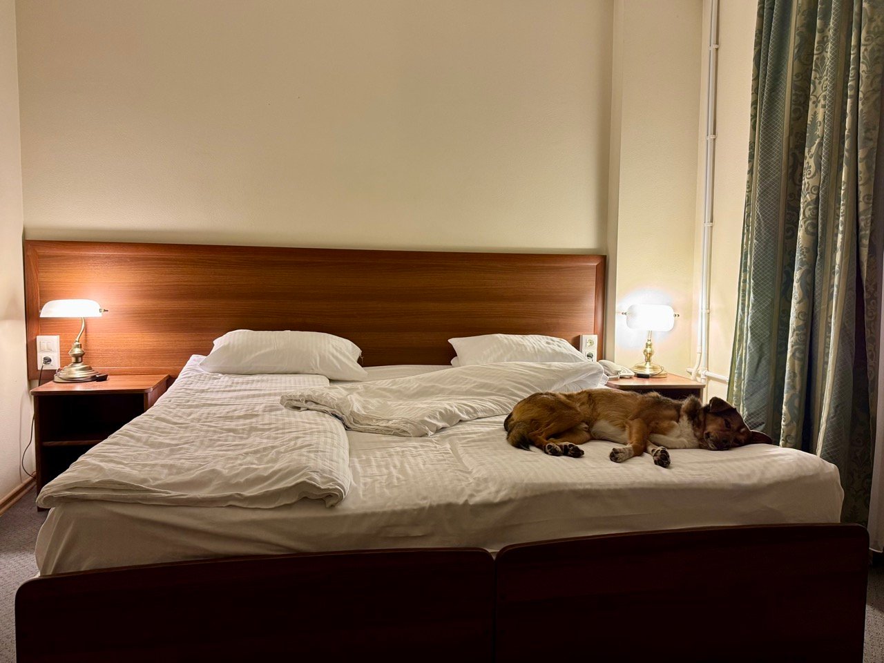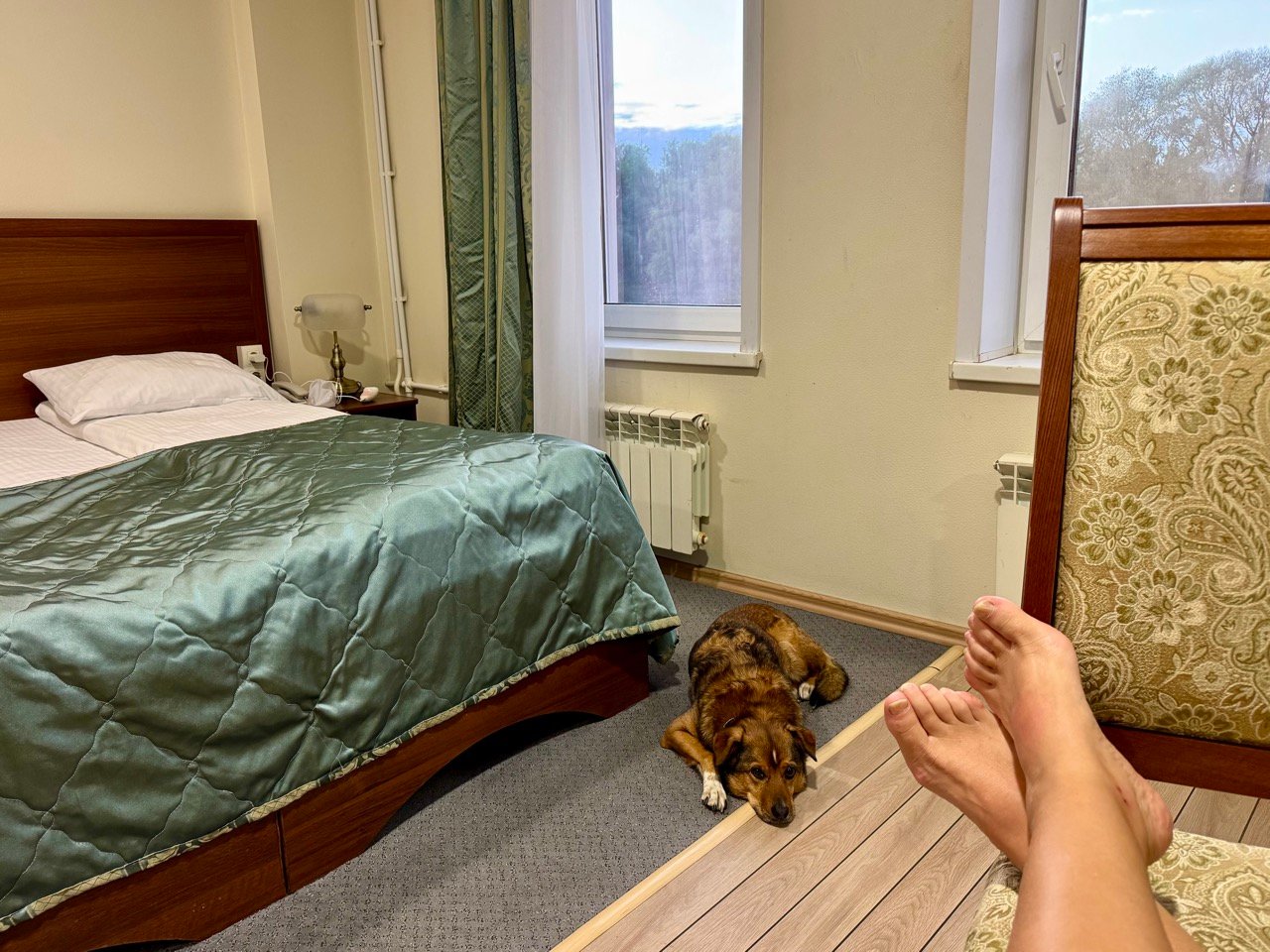 In Kolomna, we made a second attempt at a campsite, but I am not allowed to stay there either. It is 7:00 PM, and I really don’t feel like driving any further. A few phone calls are made, and a hotel on the river in Kolomna is booked, great! A room with a river view, Leo can stay in the room and breakfast in the morning is included for €55. Now I also have my Russian registration, which I have to arrange within eight days. Perfect!