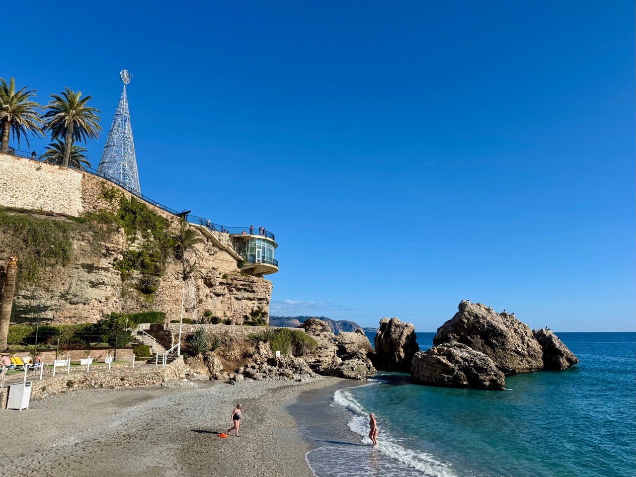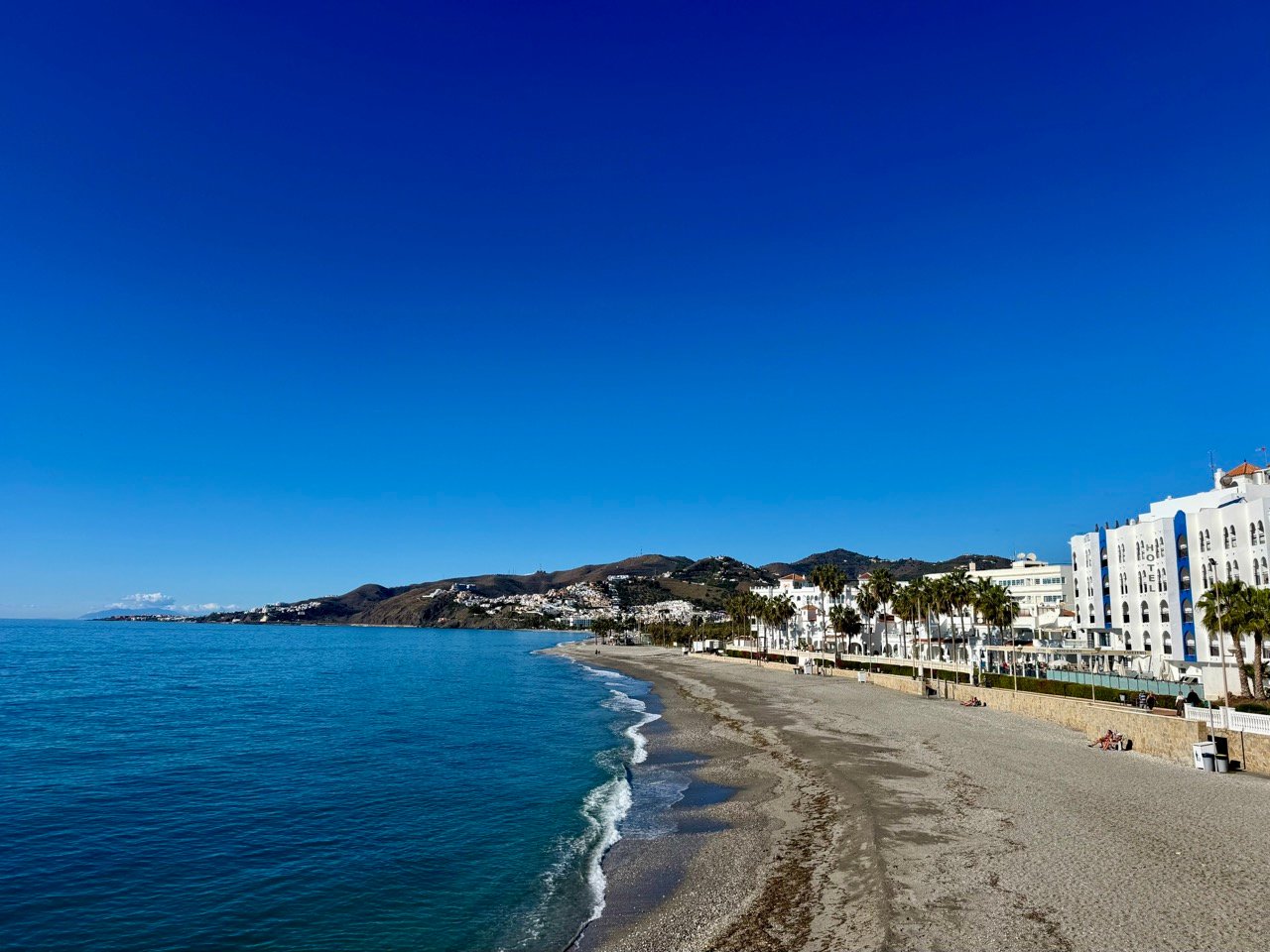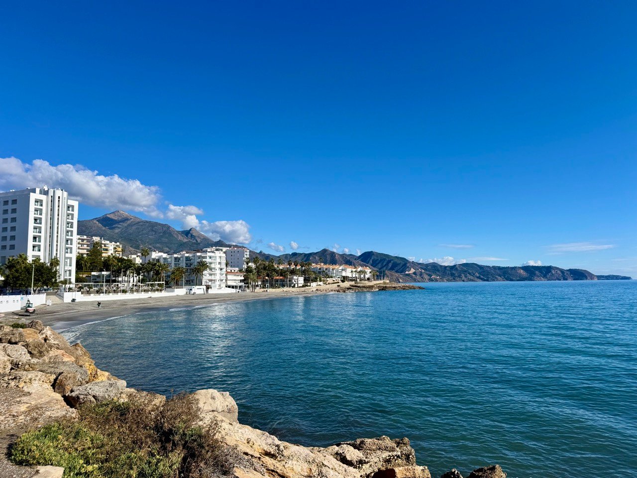 Nerja is leuk! We parkeren vlakbij een prachtig strand, er hangt een super relaxte sfeer hier. Het is ook nog prachtig weer! Leo en ik wandelen van het ene mooie strand naar het andere mooie strand, een top locatie.