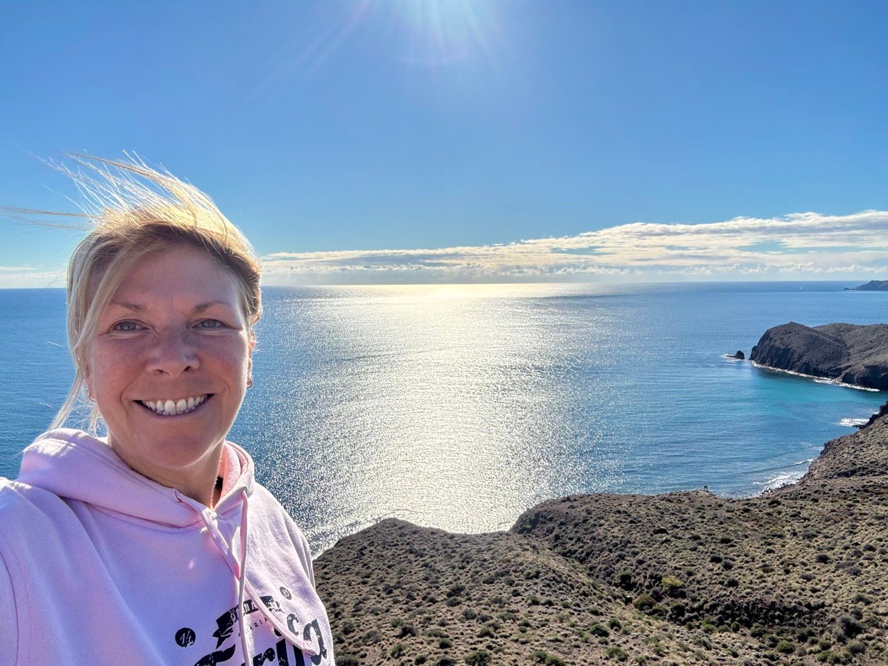 In San José wandelen we in het natuurpark Gabo de Gata. We zijn hier eerder geweest en de wandeling over de kliffen is wederom een genot. Leo rent blij heen en weer. Ik heb wijds uitzicht op zee, zie een kudde geitjes en kan eindeloos wandelen. I love it!