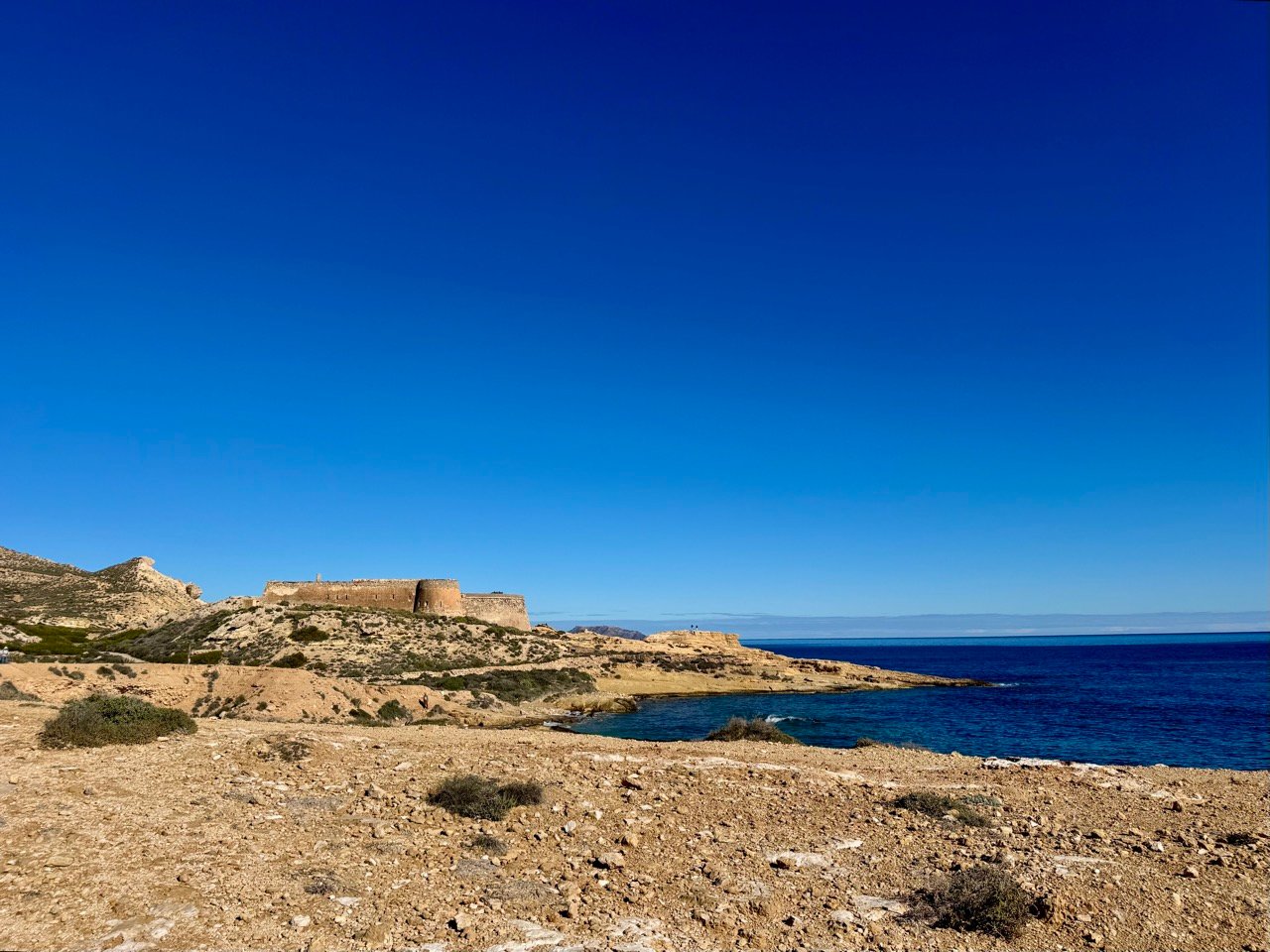 Door naar El Playazo de Rodalquilar, dit is een idyllisch strand! Leo en ik lopen eerst tussen de palmbomen en daarna over het mooie strand naar Castillo de San Ramón. Dit 18e-eeuwse verdedigingsfort was ter bescherming tegen piraten.