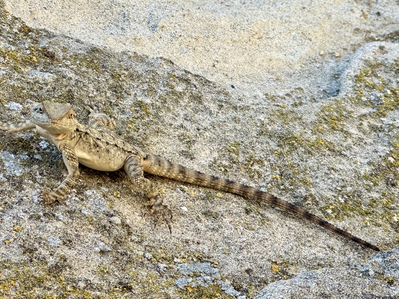 Ook al is het 38 graden we lopen naar boven en kijken in alle grotten. En natuurlijk bij de kleine kerk op de top. Ik fotografeer een mooie hagedis en Leo ligt te wachten in de grot om af te koelen. Op een fotogenieke plek, leuk!