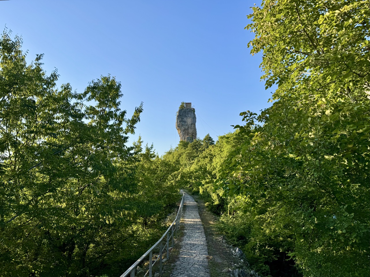 We overnachten met uitzicht op de Katskhi Pillar. Een circa 40 meter hoge pilaar met een kleine kerk bovenop, uniek! En we worden wakker met het geluid van koeienbellen, de koeien lopen naast onze camper. Het geluid van de bergen!