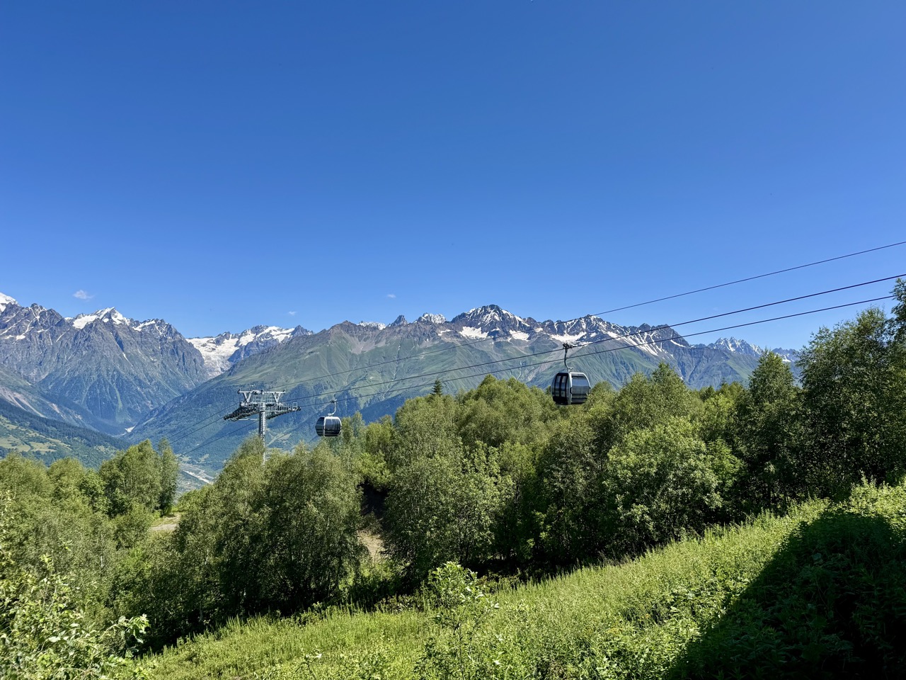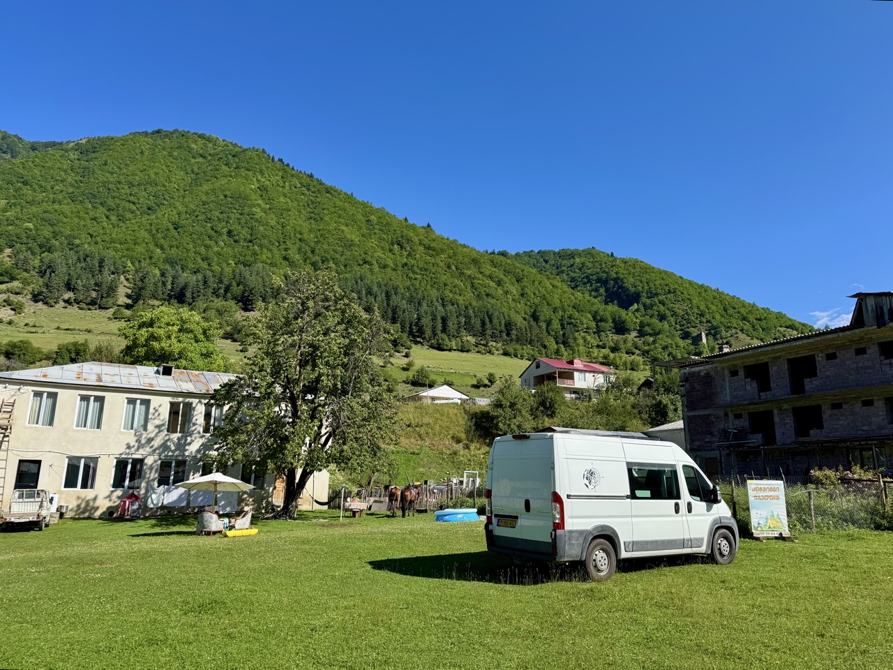 In Mestia sta ik in de tuin bij een huis geparkeerd. Er breekt een enorme regenbui los en de rest van de avond en nacht regent het. De volgende dag schijnt de zon weer! Mooi dan gaan we verder de bergen in.