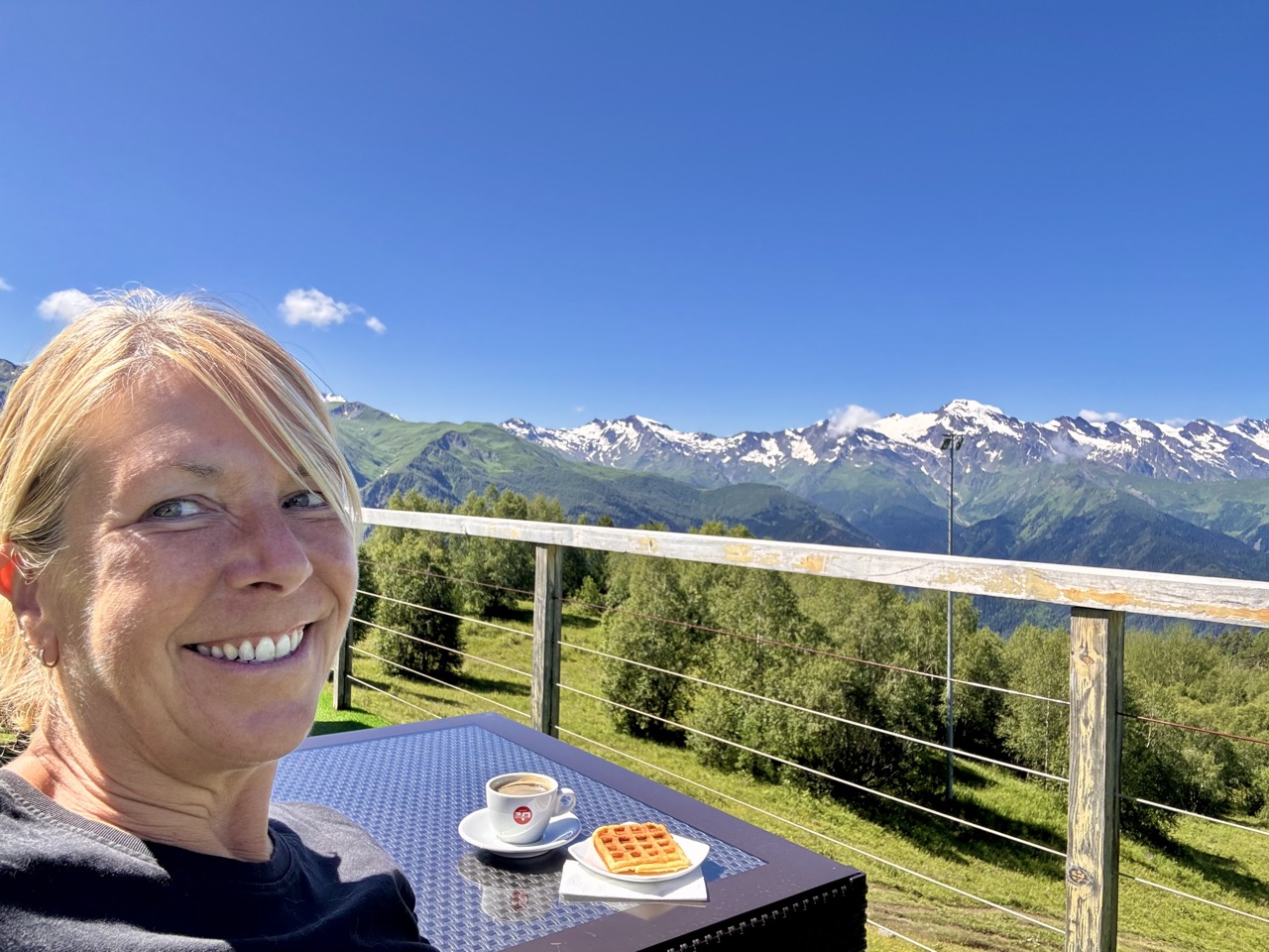 Genieten van koffie & wafel met uitzicht op de witbesneeuwde bergtoppen 😍